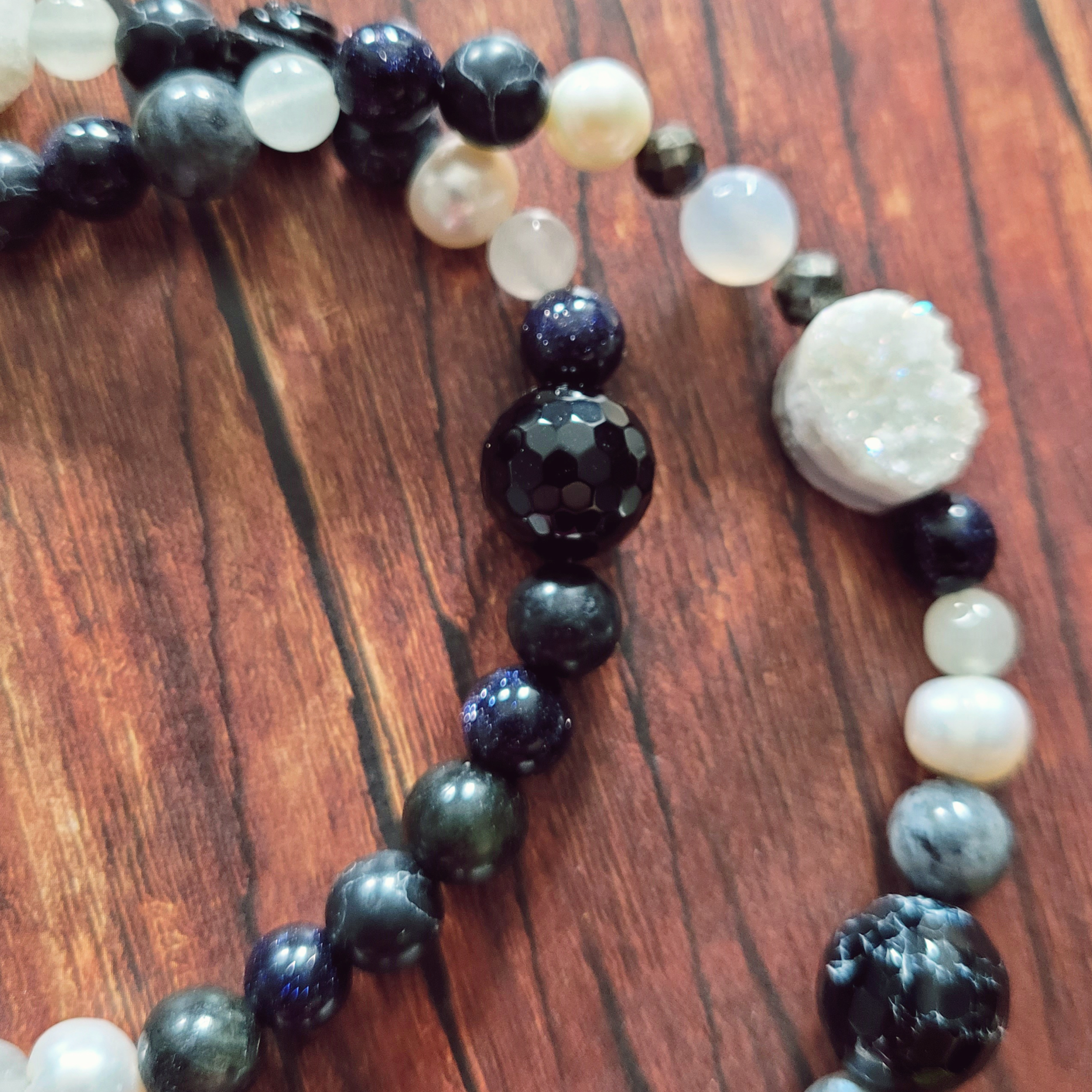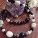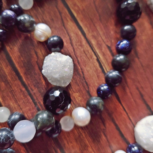 Zestaw biżuterii ręcznie robionej z naturalnymi kamieniami – onyksami, jadeitami, agatami brazyliskimi, czarnymi agatami trawionymi, jaspisami carskimi, pirytami, perłami słodkowodnymi, nocą Kairu, larvikitami oraz druza kwarcu w kolorze białym. Naszyjnik ma około 54cm długości, a bransoletka pasuje na rękę o wymiarach 16 – 20cm. Kolory dominujące to odcienie bieli w połączeniu z czernią.