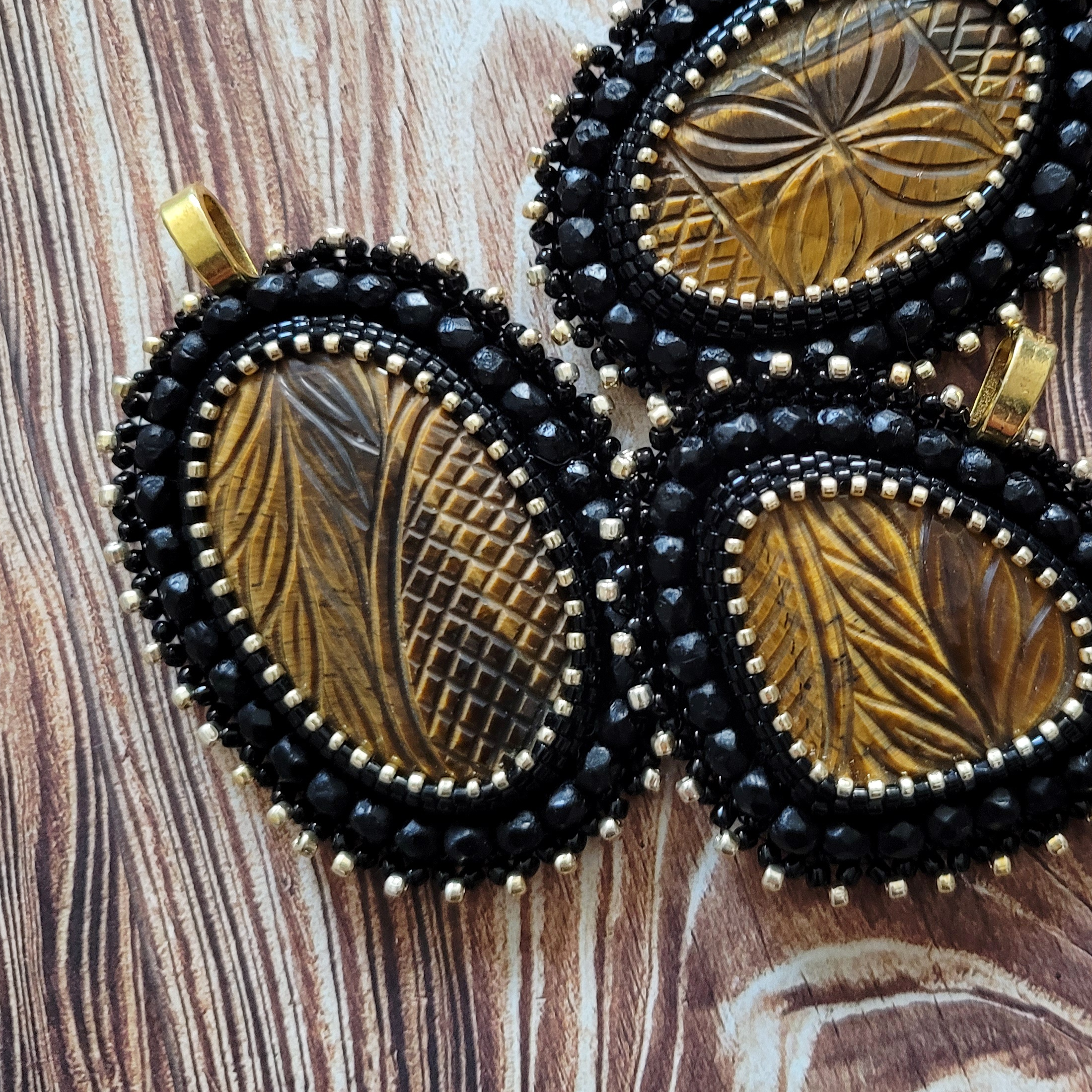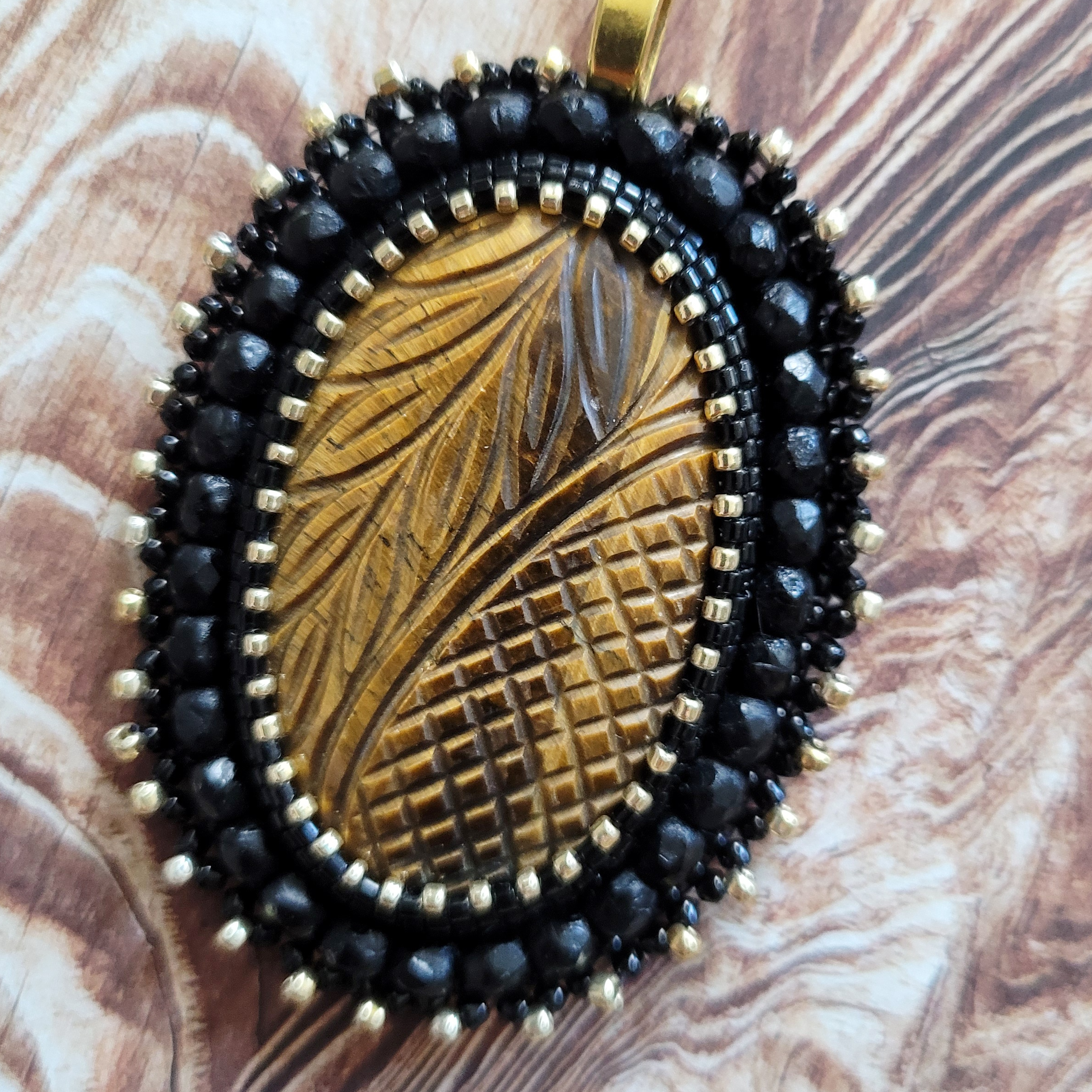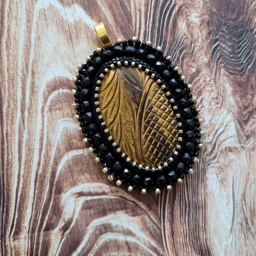 Wisior z naturalnym tygrysim okiem wykonany w technice haftu koralikowego z użyciem czarnych koralików toho oraz fasetowanych koralików w rozmiarze 4mm. Wisior ma wymiary 4x5,5cm.