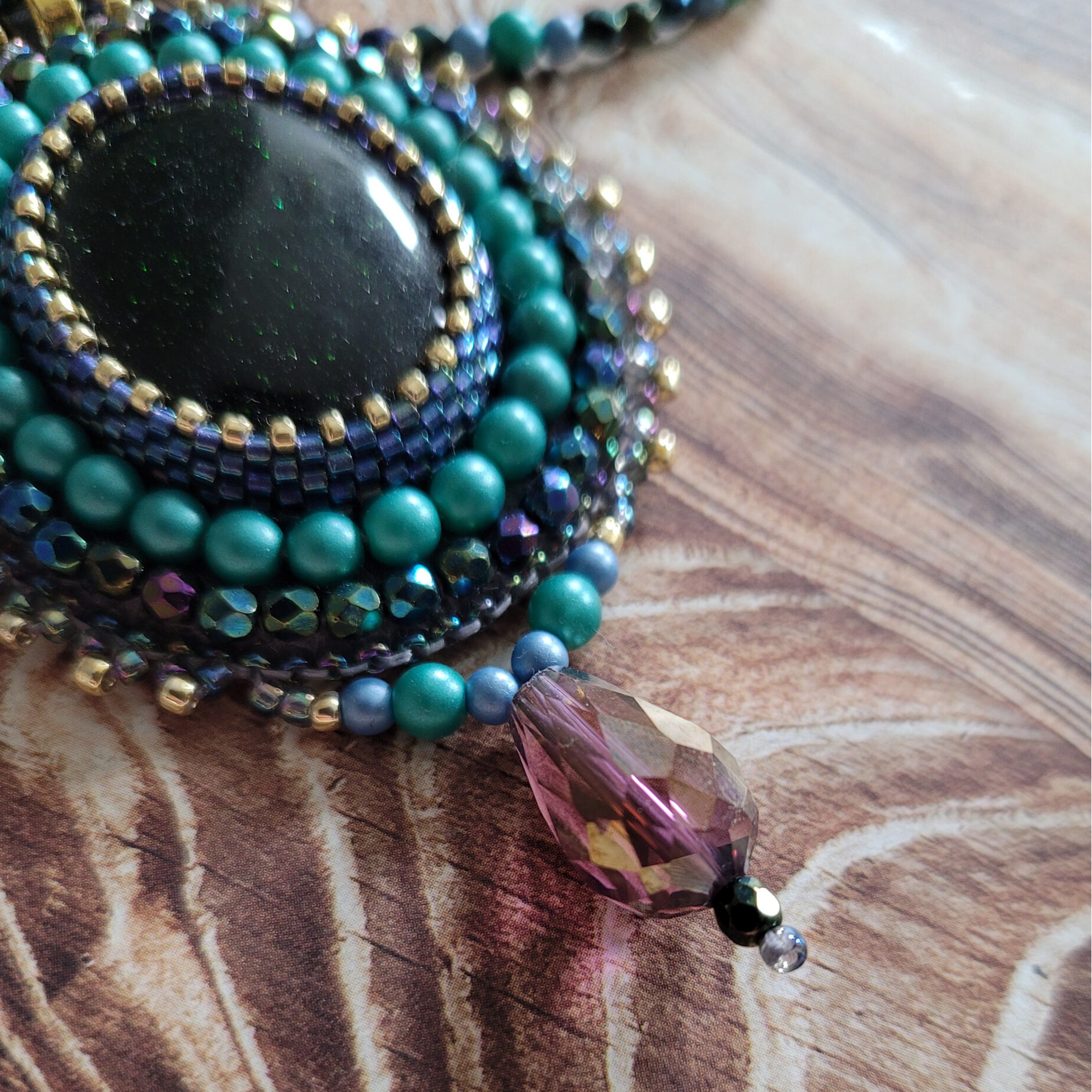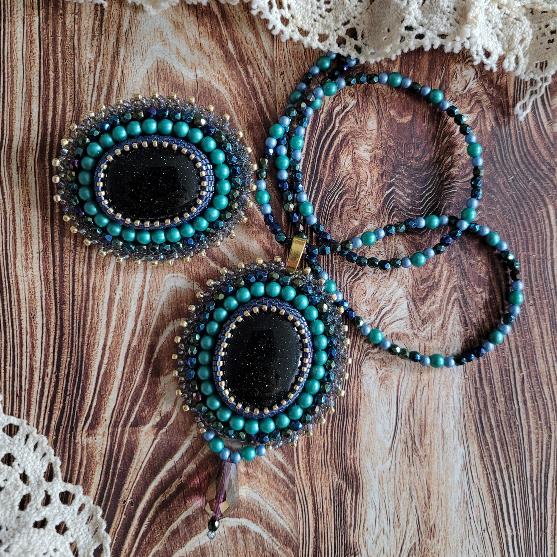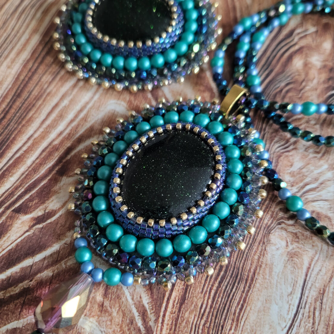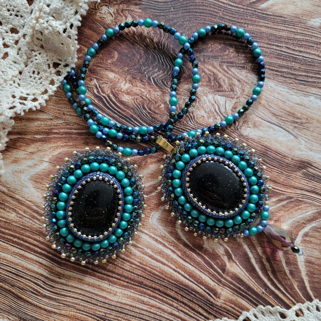 Zestaw biżuterii ręcznie robionej w technice haftu koralikowego ze szmaragdem Nilu. Piękne kaboszony z drobinkami obszyłam maleńkimi japońskimi koralikami w kolorze niebieskim i złotym. W pracy użyłam dodatkowo szklane koraliki fasetowane w kolorze błękitnym i zielonym oraz kuleczki w odcieniu lazurowej zieleni. Wisior ma wymiary 5×4,5cm z kropelką 2cm, a broszka ma wymiary 4,5x5cmcm. Podstawa wisiora z koralików na lince stalowej mierzy około 55cm.